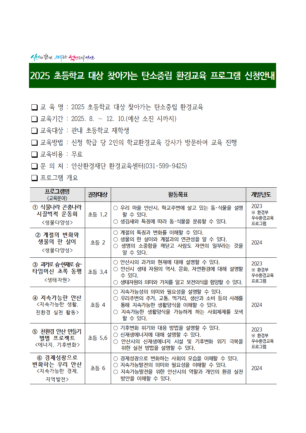 2025 초등학교 대상 찾아가는 탄소중립 환경교육 프로그램 신청안내